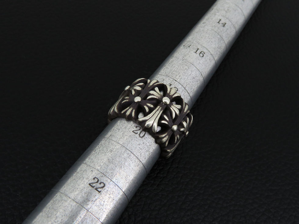 クロムハーツ セメタリークロスリング 5号サイズアップChrome Custom Company1月8日読了時間: 1分クロムハーツ セメタリークロスリングの5号サイズアップ加工を行いました。基本的なデザイン崩れがない仕上がりとなります。サイズアップ前のクロムハーツ セメタリークロスリングです。デザインが連続しているリングですので非常に難しい加工となります。